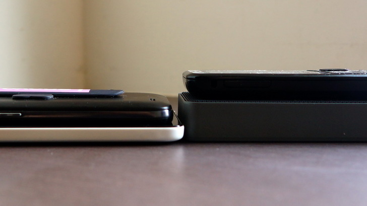 因為我手機上有貼東西,所以就不把四台機器疊在一起了。「Moment」的厚度,大概就是兩隻手機的厚度吧。