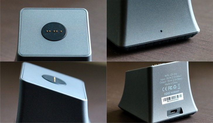喇叭很小,所以充電器也不大,充電器的本身是個斜平面的設計(30度角),這樣的設計是有用意的,喇叭放上去之後喇叭以30度角面對你,是最佳的聆聽角度。充電器的正面下方有個指示燈,後方就是連接USB線的孔位。