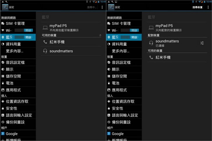 我先打開「Moment」的電源,然後打開平板的藍牙,平板上立刻出現Soundmatters的字樣,點下去之後就進行首次的藍牙配對,大概不到5秒鐘就配對完成,顯示「已連線」。如果沒有自動配對成功,可於開機後同時按下音量大小聲鍵(+及-)直至LED燈號藍色與琥珀色交替閃爍,即進入藍牙配對模式。
