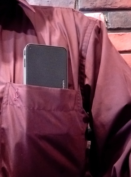 或者放在前胸口袋裡比較安全。(此為示意圖,口袋裡先放個東西故意讓喇叭露出半截,不然照片拍不到喇叭)
