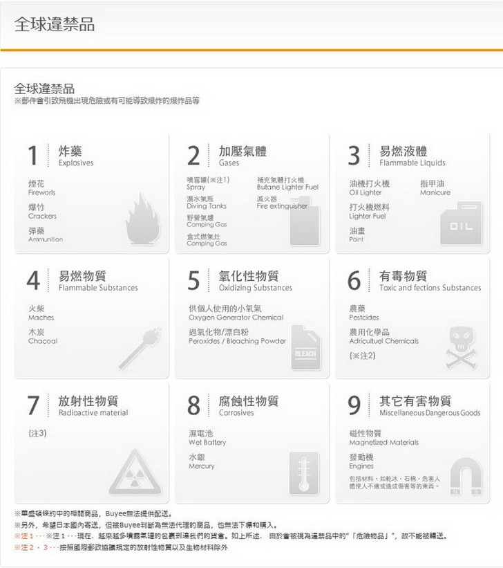 但是說到透過Buyee什麼都有,什麼都可以買,又幫你運回家,大家還是要守法的,基本上萬國郵政公約等規章中所列禁寄物品為原則性規定,但各國又依其國內法將規範予以擴大。