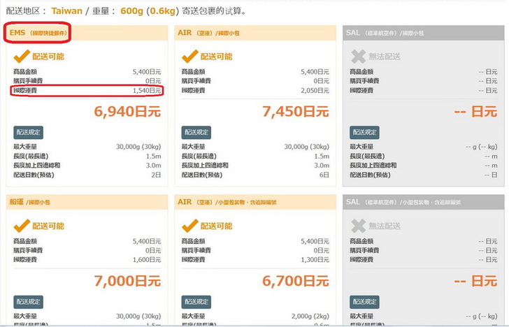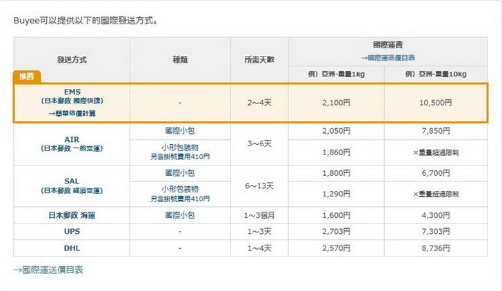 Buyee推薦使用EMS,一般來說我們會想在日本買的東西大多都是輕薄短小的小東西,用海運真的是殺雞用了牛刀,時間久又沒有比較便宜,至於快遞,以前我有幾次不愉快的經驗,寄送很快但是報關很慢,整體算起來比EMS還慢。所以我個人也是推薦EMS。