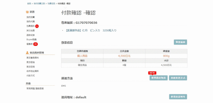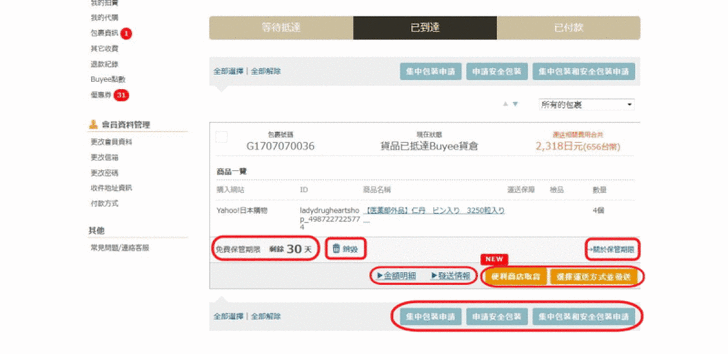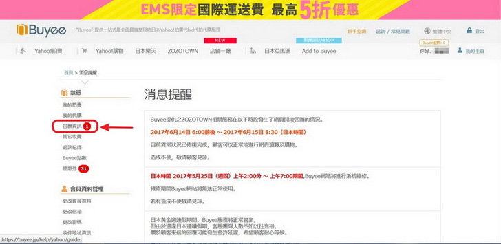 趕快進入Buyee網頁,果然「包裹資訊」那邊有一則新訊息啊。