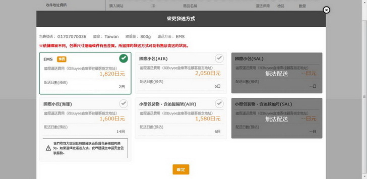 選擇你要的運送方法,預設是EMS,如果你想省那一點點錢,你可以改選AIR。
