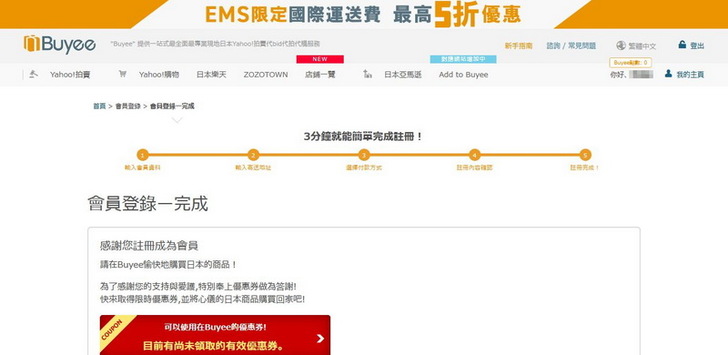 這就是註冊完成的畫面啦,為了感謝你註冊,所以送了幾張優惠券給你。