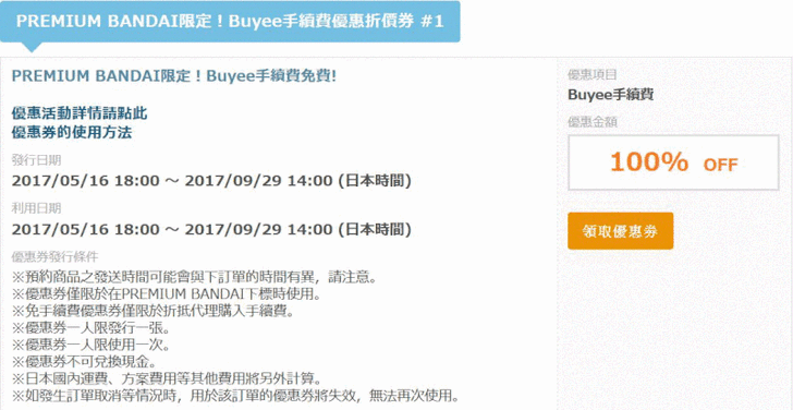 有PREMIUM BANDAI的手續費免費券與運費八折券,還有樂天商城的九五折券。