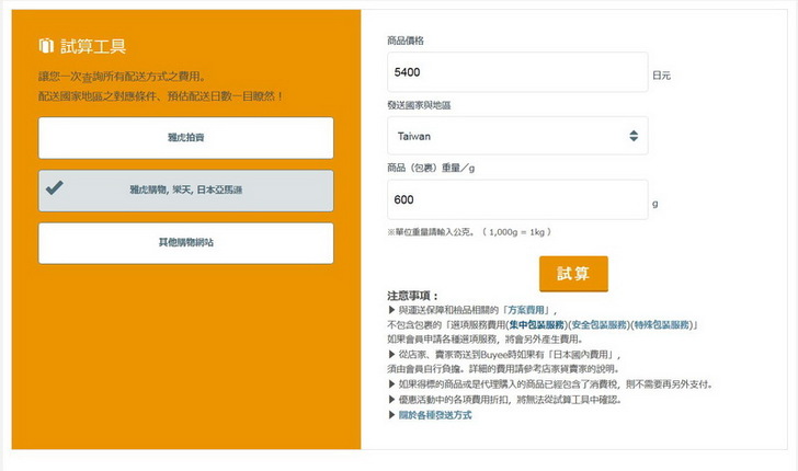 Buyee提供了簡單的海外運費試算表,你在買東西之前可以先試算一下。