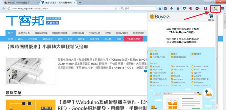 當插件安裝完成之後,瀏覽器右上角有個小圖示是個+字與禮物盒,那就是Add to Buyee安裝完成了。按下之後就會出現Buyee的小畫面。