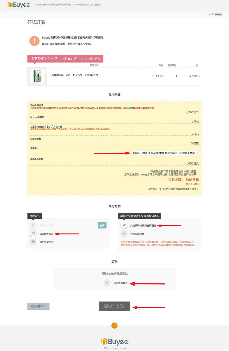 再次的確認購買的品名數量金額,是否購買類似保險的方案(這裡確認之後就不能再改了喔)。接下來最重要的一點是如果你有優惠券的話,請在這裡使用,這裡Pass過了後面就沒有地方可以叫出來用了。接下來確認使用信用卡付款,確認只訂購買得到的東西,接受使用條約,確認訂購。總之我用紅箭頭標示的地方請都要按下去,這樣才是訂購完成喔!!