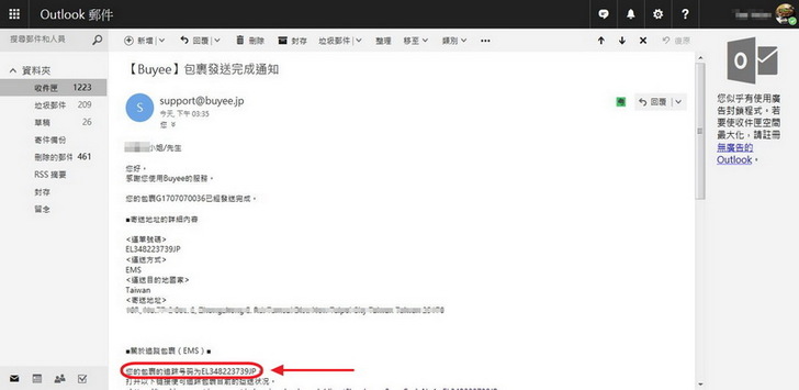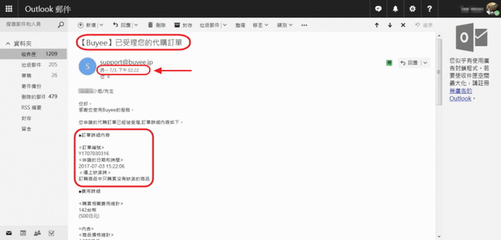 這裡的已訂購代表的是你向Buyee下單完成,並不代表Buyee對廠商下單完成了,這點要特別留意。但也不要太緊張,依我的例子來看,我是2017-07-03的15:22下單給Buyee的,不過這是日本時間,台灣時間是下午02:22。經過1個小時又3分鐘後,也就是台灣時間下午03:25收到Buyee的郵件,Buyee已經下單給廠商了啊,很快的啊。 (注意看我畫箭頭的地方)