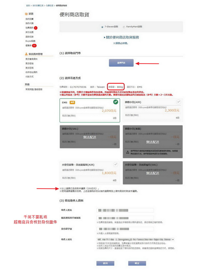 但是如果選超商取貨的話,運費要多收日幣250元(出現的金額已內含),也要寫收件人的資料,這裡請務必不要開玩笑,超商會要你的證件做核對,亂寫可是不能取貨的喔。