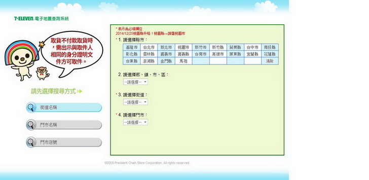 首先是選擇超商門市,以小七為例,按下選擇門市的按鈕就是進入小七的系統了。大家應該很熟了就不多提。