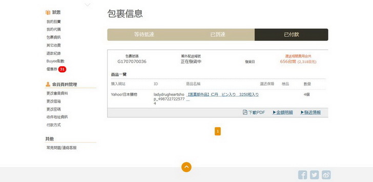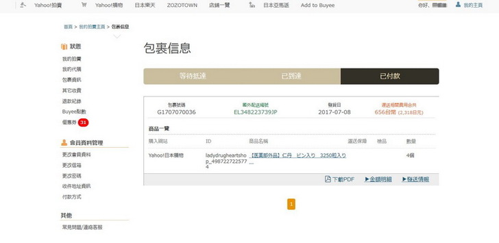 最後我的Buyee主頁的包裹信息從「已抵達」變成了「已付款」,接下來就是在家等包裹上門啦。