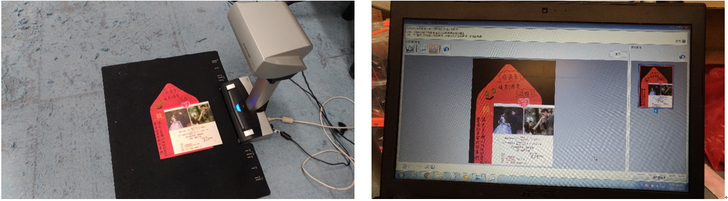 在測試過程中拿大張超過A3的手繪畢業紀念冊封面,隔著透明塑膠帶,從手機拍攝的照片可以看出明顯的反光,透過富士通影像掃瞄器 ScanSnap SV600掃瞄,反光部份幾乎消失,但最好還是取出掃瞄較佳,手繪畢業紀念冊封面因為太大也無法顯示,後來就先掃半張接近B4大小就可以完成掃瞄。
