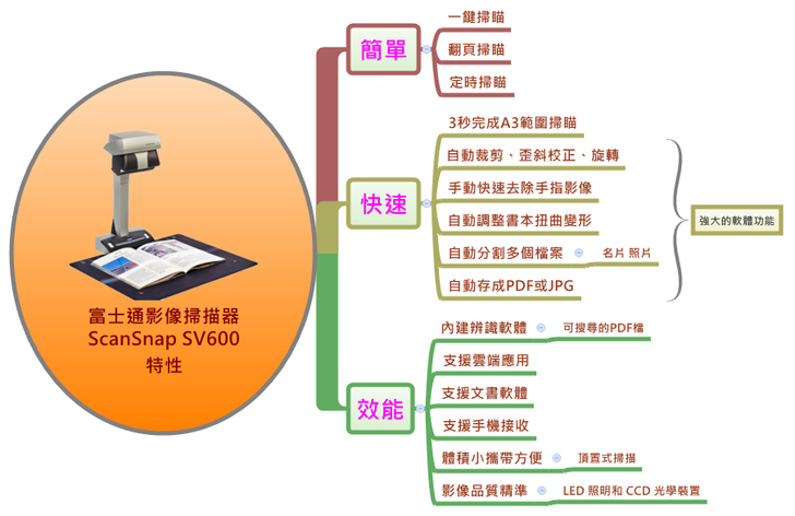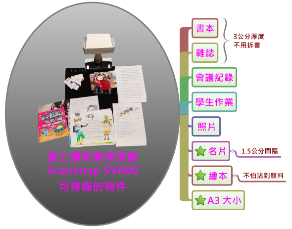 前年資訊月在台北市貿中心會場的二樓,有一場教育資訊相關的特展,現場擺放一台富士通影像掃瞄器 ScanSnap SV600,一台像枱燈大小不佔空間,可以掃瞄書本到A3大小,影像精準不失真,令我印象深刻,這次有幸可以參加富士通影像掃瞄器 ScanSnap SV600,準備這次在學校的教育用途上做作各種可能的發想,以下是我整理的懶人圖。