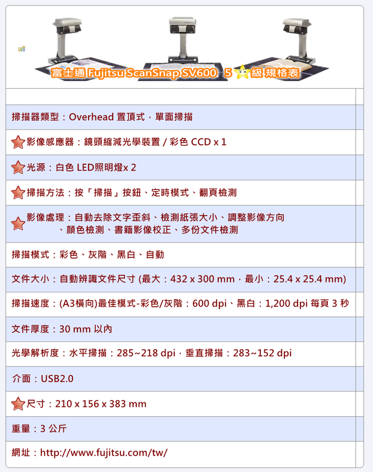 【▼】富士通影像掃瞄器 ScanSnap SV600硬體規格表