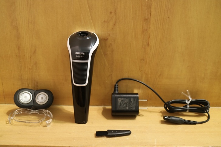 內容物排排站。裡頭有:刮鬍刀機身,刀頭,刀頭保護蓋,充電器,小刷子