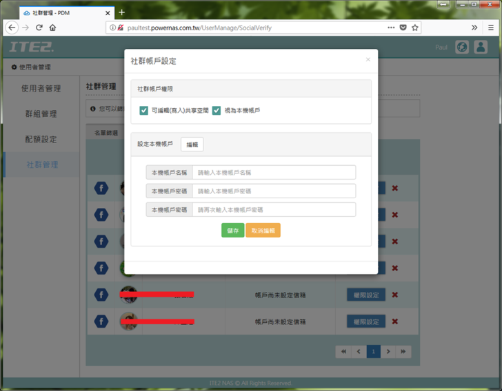 使用者管理可以設定本機帳戶對於每個功能的權限、配額、群組分類等等,而社群功能只要先到「個人化設定」內綁定FB或google+帳號,FB的好友就可以在登入畫面一鍵申請登入NAS,而管理者也可以審核每個申請登入的好友,還有分別管理每個好友的權限,甚至可以建立綁定一組本機帳戶。社群功能對於電腦苦手在管理使用者確實相當方便!