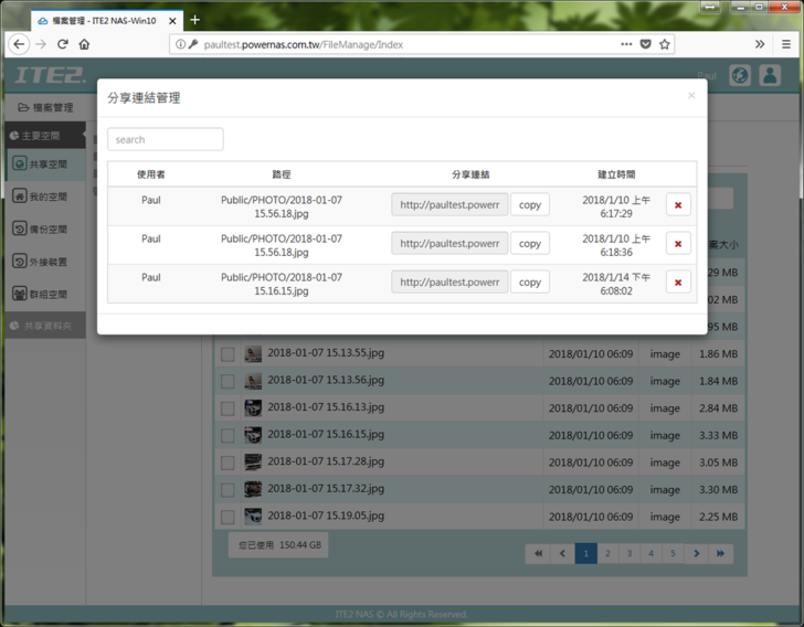 檔案管理可以對於常見格式的圖檔、影片檔、音樂檔進行預覽,基本的增刪改查也都有,還有針對不同帳號顯示自己的空間,以及USB外接的空間、共享的空間資料夾進行管理,比較值得一提的是可以針對單一檔案產生分享連結,並統一進行管理,這點對於時常需要分享檔案給別人下載相當方便!
