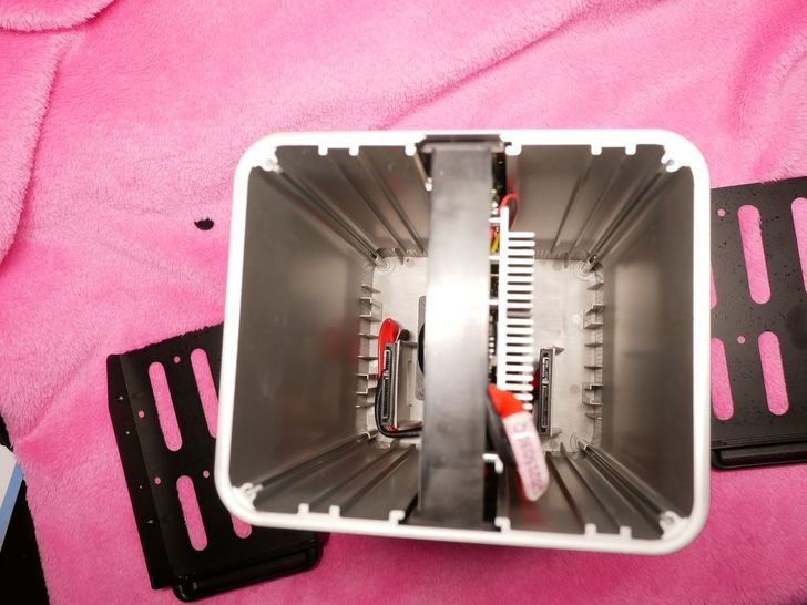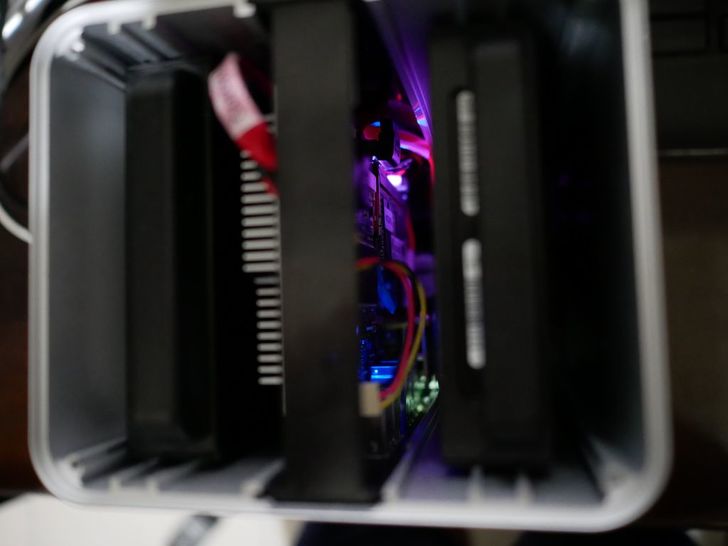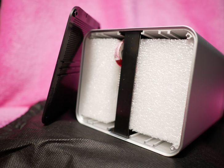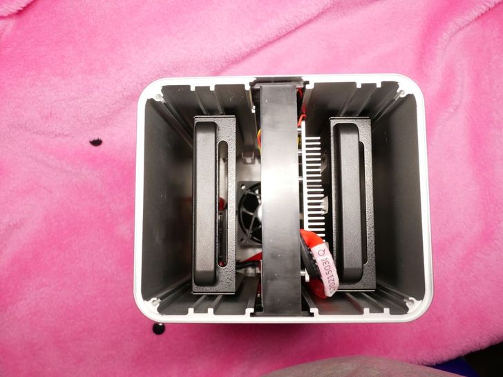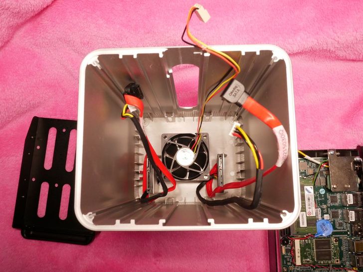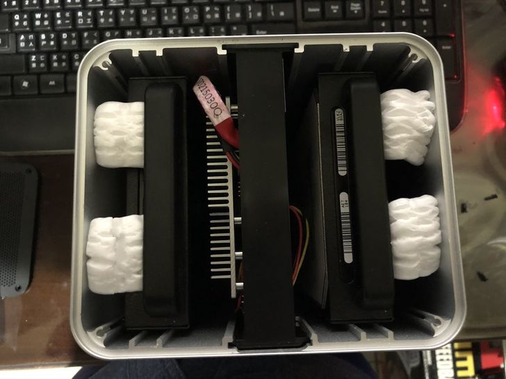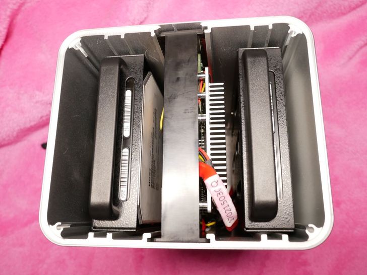 取下保護泡綿之後可以清楚看到裡面,左右兩側為硬碟支架,中間是主機板