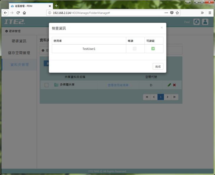 硬碟管理頁面除了基本硬碟資訊以及Raid設定以外,還有資料夾的管理,嚴格來說就是管理分享的資料夾,使用者的權限等等,包含大家不陌生的win10資料夾共用,都可以在這裡做操作。