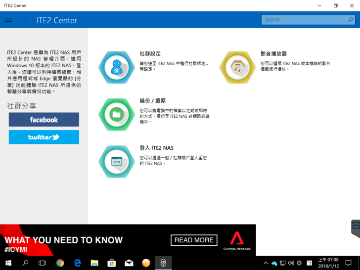 ITE2小工具目前內容只有一個「ITE2 Center」,ITE2 Center是Windows的程式,有四個功能入口,其中登入ITE2 NAS與社群設定是設定NAS使用。