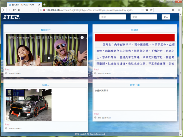 便利貼會顯示在登入頁面,除了文字、圖片以外也支援html,甚至可以嵌入youtube,在多人環境對於一些公告佈達或暫存提醒滿實用有趣的,不過希望未來可以增加類型分類以及相關篩選的功能,這樣資訊瀏覽起來就更方便。