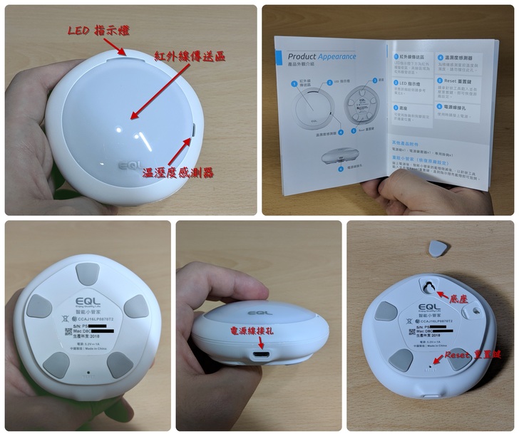 智能小管家的外觀是五角形狀,正面上方有 LED 指示燈,右方是溫溼度感測器,而中間一大片都是紅外線傳送區;底部有 Micro USB 接孔供電,背面上方拆掉防滑墊後可以安裝壁掛底座,下方則是重置孔。