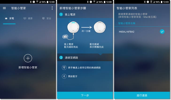 成功登入後,我們要先新增控制所有裝置的中心 — 智能小管家。手機會先要求開啟藍牙來搜尋智能小管家,接著讓智能小管家連至家中的無線網路,並將裝置重新命名(圖中命名為:LivingRoom),即可設定完成。
