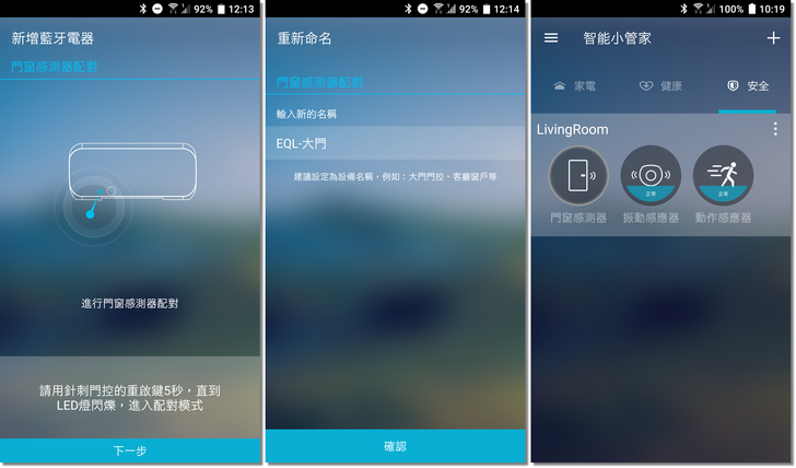 然後是配對,不同感測器的配對方式不同;配對完成後,為這個感測器命名,以便之後在收到通知後才會知道是哪個感測器。