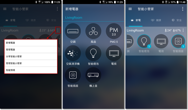 智能燈泡、智能插座,或是用紅外線控制的電器要在"家電"頁面中新增。按一下指定的智能小管家畫面右上角 → 新增電器,目前支援冷氣、風扇、電視等能用遙控器來控制的家電。