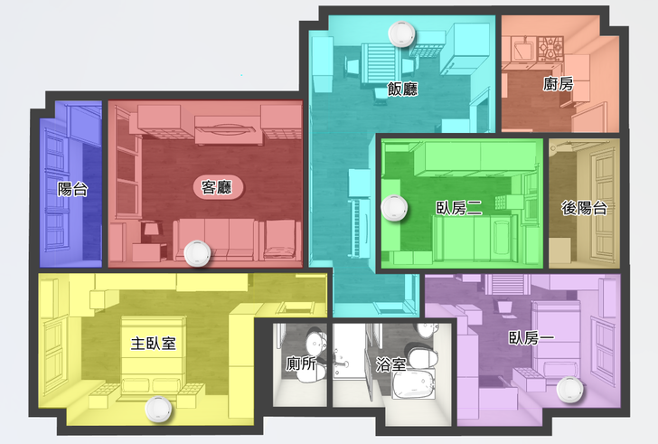 1. 建議每個房間和客廳、飯廳皆各安裝一台智能小管家;如圖,若是裝在廚房的感測器或智能插座,或是陽台大門的門窗感測器,由於靠的是藍牙傳輸,在飯廳和客廳的智能小管家就能接收訊號了。