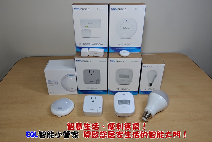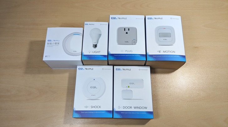 EQL 宜優科技推出的「Ripple 智能家居」擁有許多產品周邊。除了控制中樞"智能小管家"外,感測器有"懸浮粒子/動作/震動/門窗感測器"四種;另外還有"血壓計"、"空氣清淨機"、"智能插座"和"智能燈泡"四種設備。