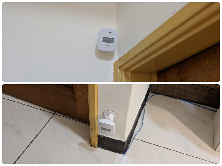 門窗感測器安裝較簡單,由於感測器是用魔鬼氈固定,如果沒有黏好或黏的靠近,能撕下來重新黏。打開門時,兩塊感測器會分離,這樣就會有開門反應。