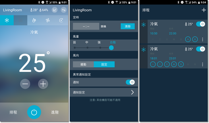 冷氣的遙控除了基本開機關機、冷氣溫度;風量風向等控制,還有定時關機和排程的功能;排程可以設定星期幾的何時要打開冷氣、開多久,以及開啟的溫度。