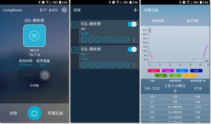 智能插座的最大功用就是可以管理用電量和電源排程。如下圖所示,筆者所使用的捕蚊燈耗電功率為 16.7 瓦,使用者能為它設定排程,例如每天晚上七點到早上六點自動打開捕蚊燈;並且能查看每天的耗電量。