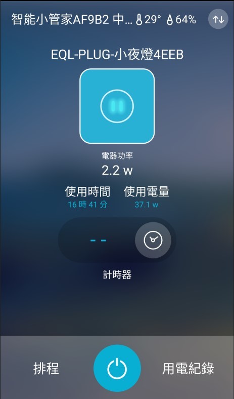 除了排程開關外,還有使用電量的耗電瓦數可以參考、讓我們更清楚知道這個電器的耗電狀況如何。