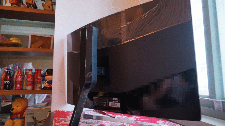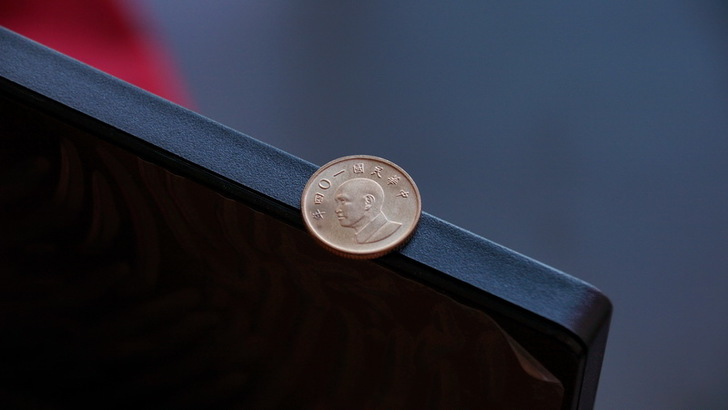 安裝完成之後,你會發現,挖……這顯示器是曲面的,好炫啊,而且很薄呢,拿個一元硬幣來當對照比較好了解。