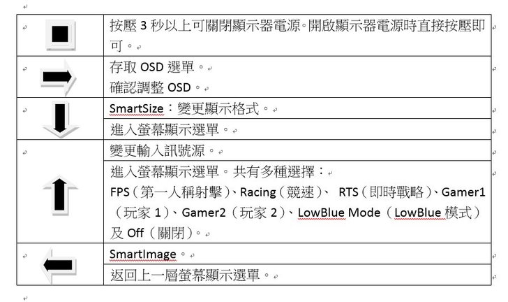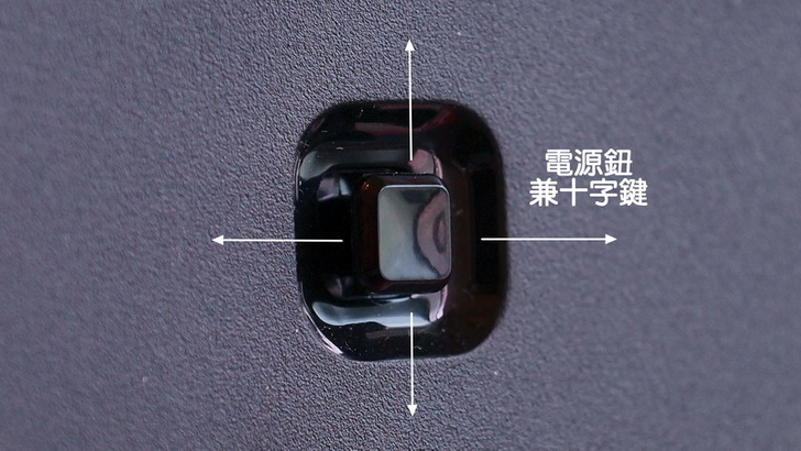 看了半天,居然找不到電源按鈕,原來藏在後方,有個十字鍵,長按就可開關機,同時也可以四方向觸動顯示器的OSD功能。