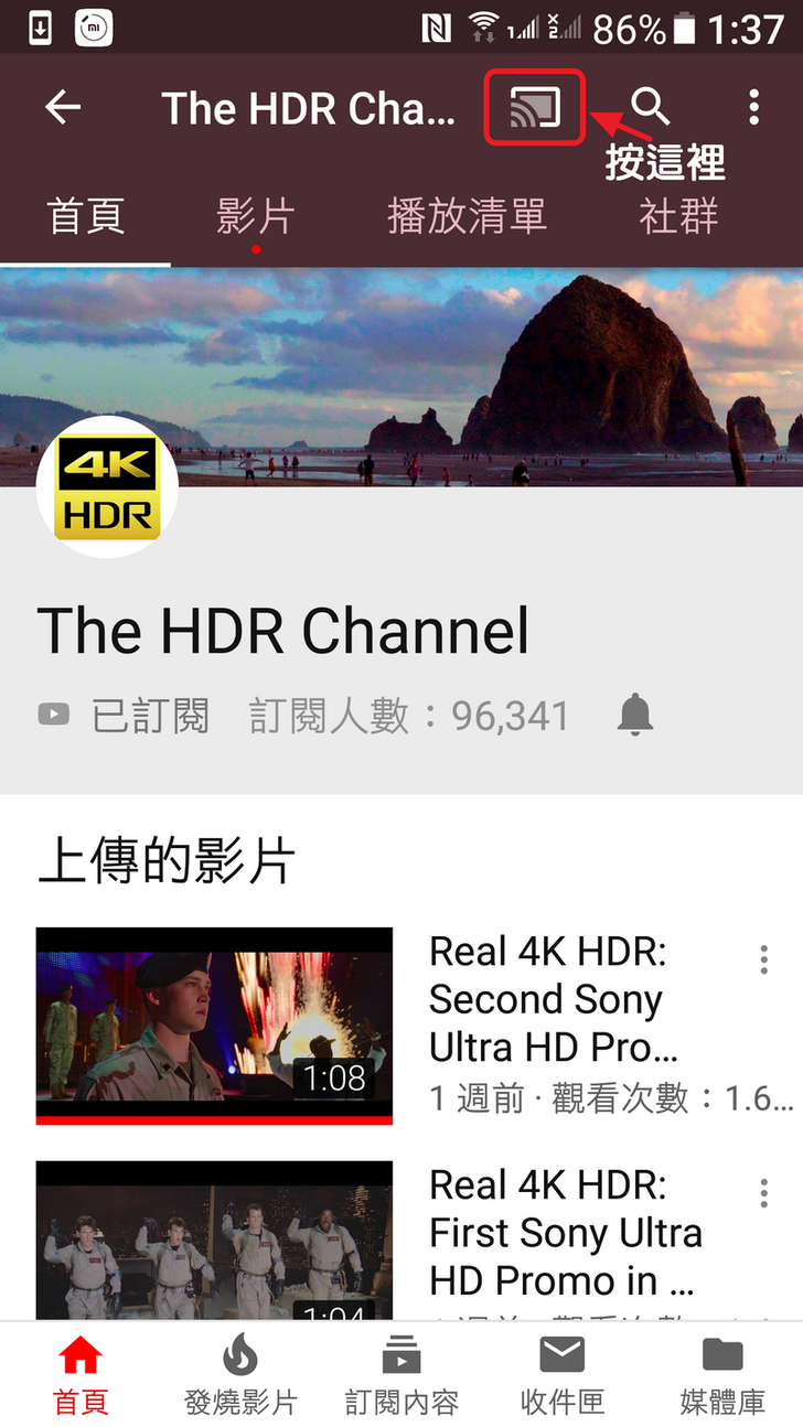 只要在我畫紅圈的串流符號按下去即可 ,不是只有Youtube才可以,如Google Play Movie,Netflix或者你手機裡的相簿等,只要你在APP看得到那個串流符號都可以,但前提是那個媒體要提供4K HDR的串流影音或者4K畫質的圖片才可以,不然就只是一般普通的串流影音與圖片。