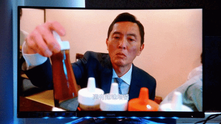 這部影片的重點就是吃,所以男主角大口吃食物的鏡頭就是本片重點中的重點,不過晚上看這部片子的最大缺點就是會想吃宵夜,KKTV的影片雖然沒有4K HDR的效果但是也有1080p的畫質,所以在Philips 328M6FJRMB 31.5吋曲面顯示器上播放畫質依舊相當良好,絕對遠遠超過你在其他奇怪網站看到的效果。