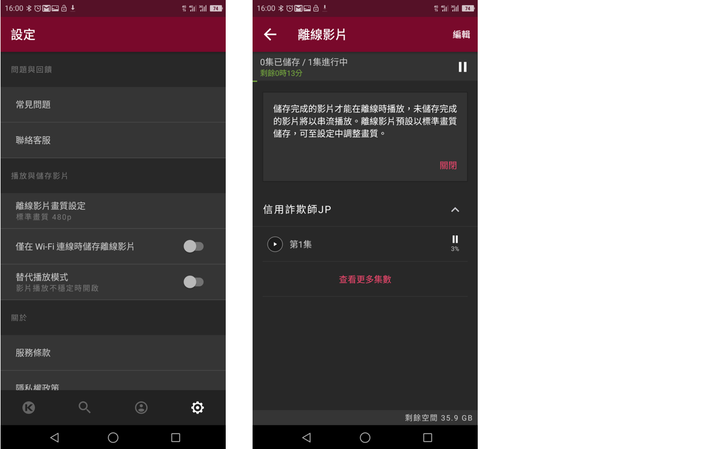 而且還可以把影片離線下載, 離線畫質還可以還擇標準畫質480P與清晰畫質 720P,這樣子在沒有網路