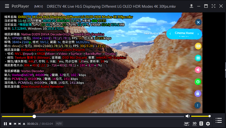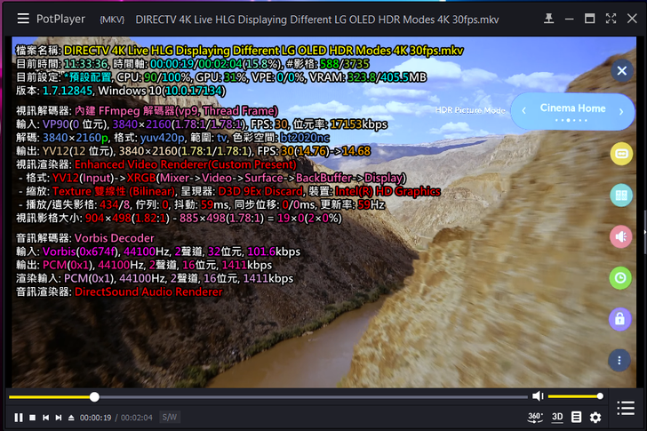 使用硬解(顯卡), FPS畫面張數大約23-25,依舊都有掉格問題存在,比起軟解來說是有順暢些。