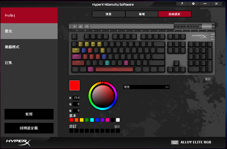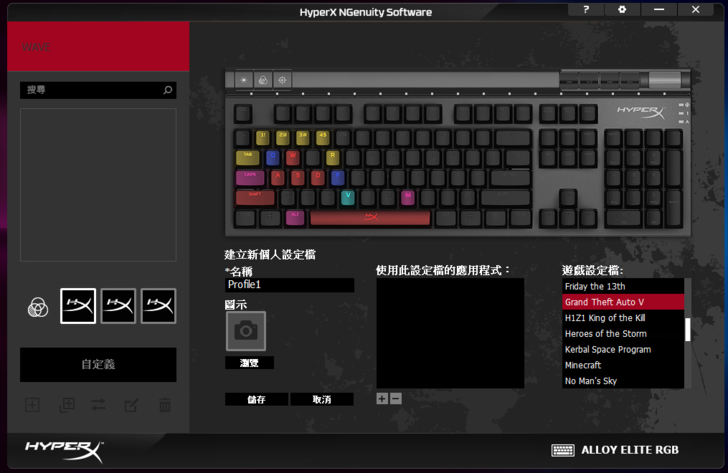軟體也有定義衣鞋熱門遊戲的設定檔,如GTA5,將遊戲常用的按鍵已燈效做區別