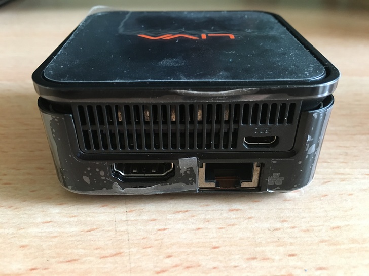 後方上方為散熱風扇與散熱鰭片的散熱孔,下方為HDMI影音輸出與Giga LAN,右上方為電源供應器輸入孔,這邊需特別注意接頭一樣採用Micro USB接頭設計,但此迷你電腦必須輸入12V/2A,非現行手機5V電壓,所以不可以拿行動電源對這台迷你電腦供電!,但如果可以設計成用行動電源供電應該會更方便~
