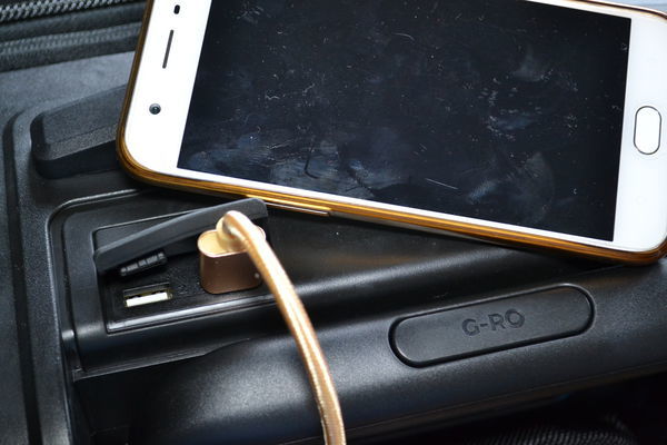 G-RO登機箱還有一個很特別的設計,那就是它內附USB插座,在箱內將行動電源插上,在外面就可以即時為手機或平板充電,不用再去翻找包包或行李,隨插即用相當方便!