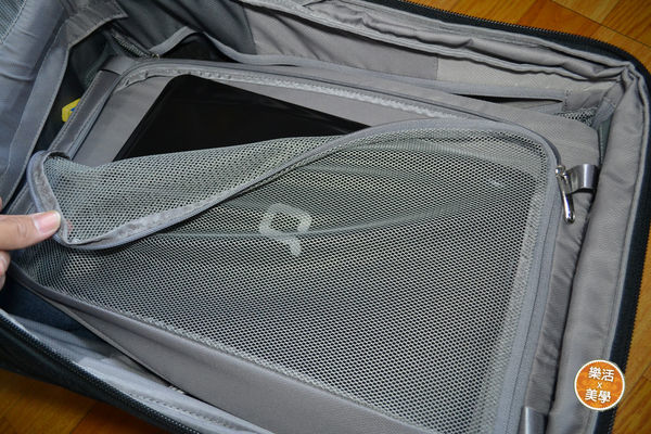 蓋上中蓋還可以放筆電用品,夾在兩面衣物之間,亦能受到緩衝保護,設計很有巧思,四個角落一扣即可固定。