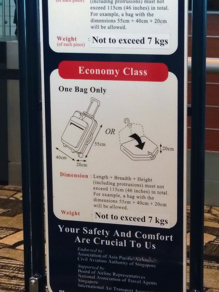 這是機場手提行李的告示牌,手提行李的尺寸長寬高加起來的總和不得超過115公分,這個G-RO登機箱的長寬高是35.5 x 55.8 x 22.8公分,加起來是114.1公分,剛好不超過115公分,所以可以手提上機。