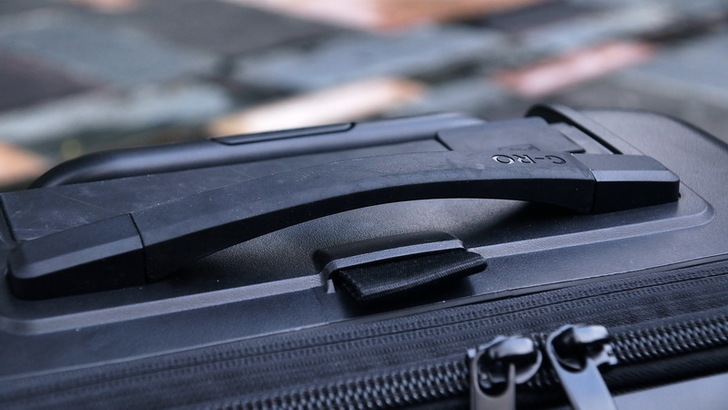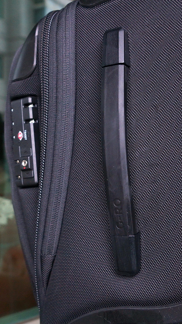 老實說,登機箱的正面不太起眼,一整個是素面黑色,但看起來非常的粗勇,G-RO登機箱的材質採用高分子聚合物塑膠為主幹,尤其是底部完全是塑膠,所以如果地面有水,登機箱經過也不會弄濕,搭配超耐用彈道尼龍布 (ballistic nylon)