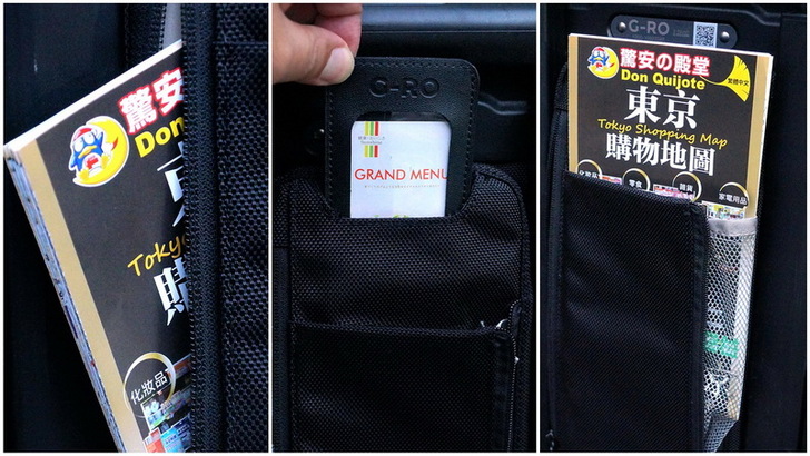 G-RO登機箱的背面依舊有三個收納小空間可以使用,你放個地圖,名牌都很合適。